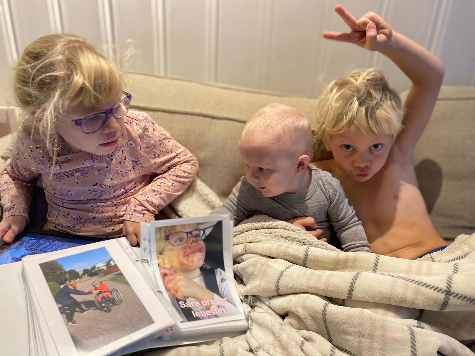 Kasper syns det er stas å passe på de to søskena sine. Da jeg lufta bikkja en kort tur, hadde han plukket opp Victor fra gulvet og satt han mellom seg og Sara.